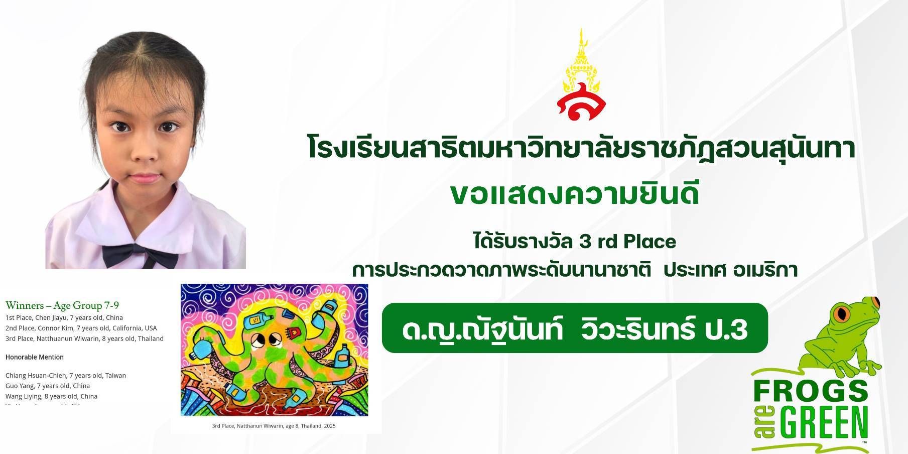 โรงเรียนสาธิตมหาวิทยาลัยราชภัฏสวนสุนันทาขอแสดงความยินดีกับศิลปินตัวน้อย ในการประกวดวาดภาพระดับนานาชาติ ในรายการ  The 16 Annual Kid Art Contest , 2025 จัดโดย มูลนิธิ Frogs Are Green ประเทศสหรัฐอเมริกา