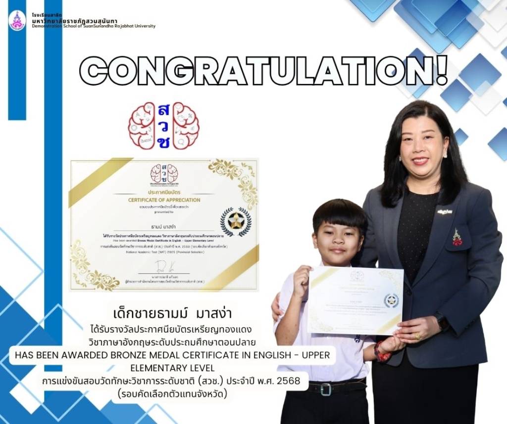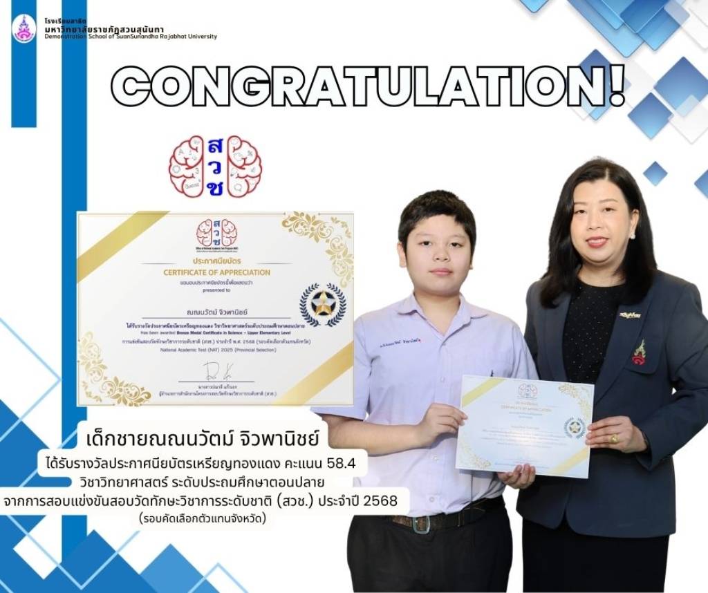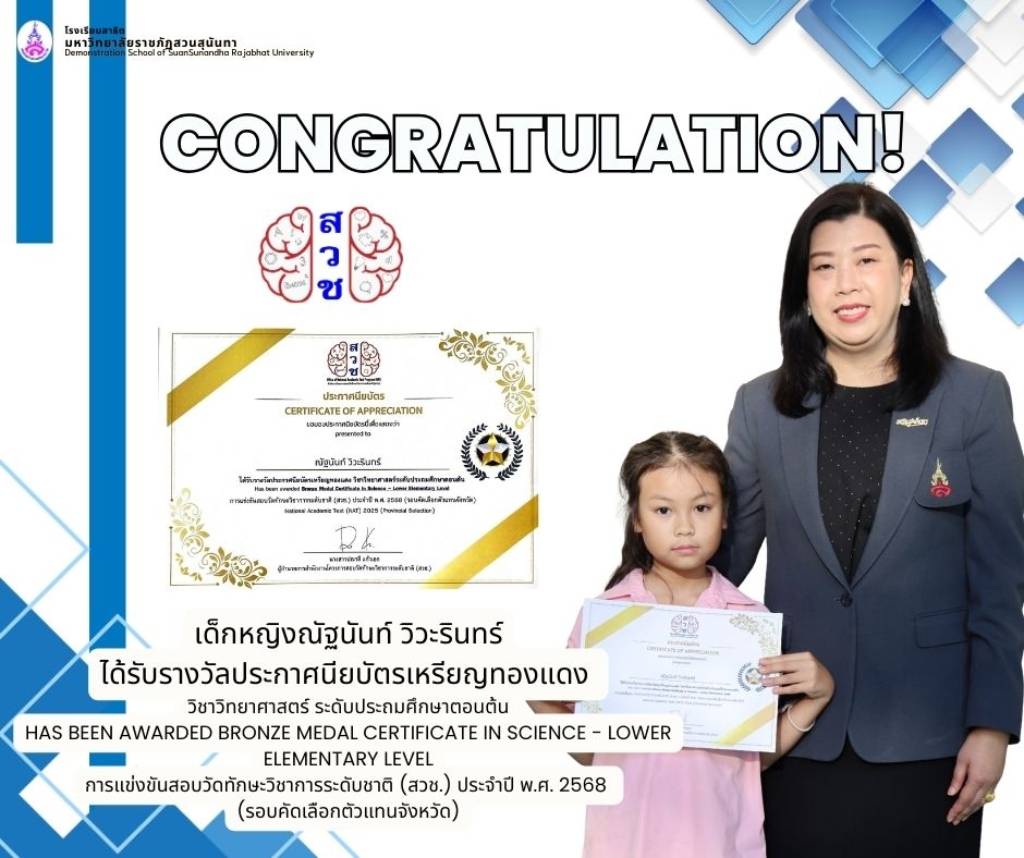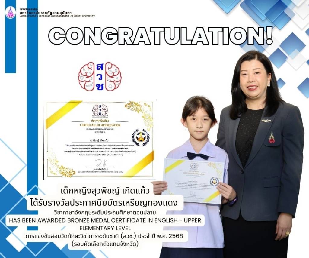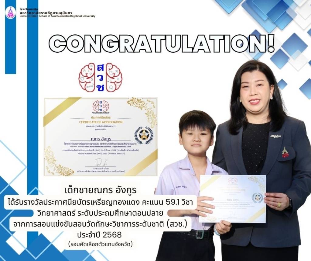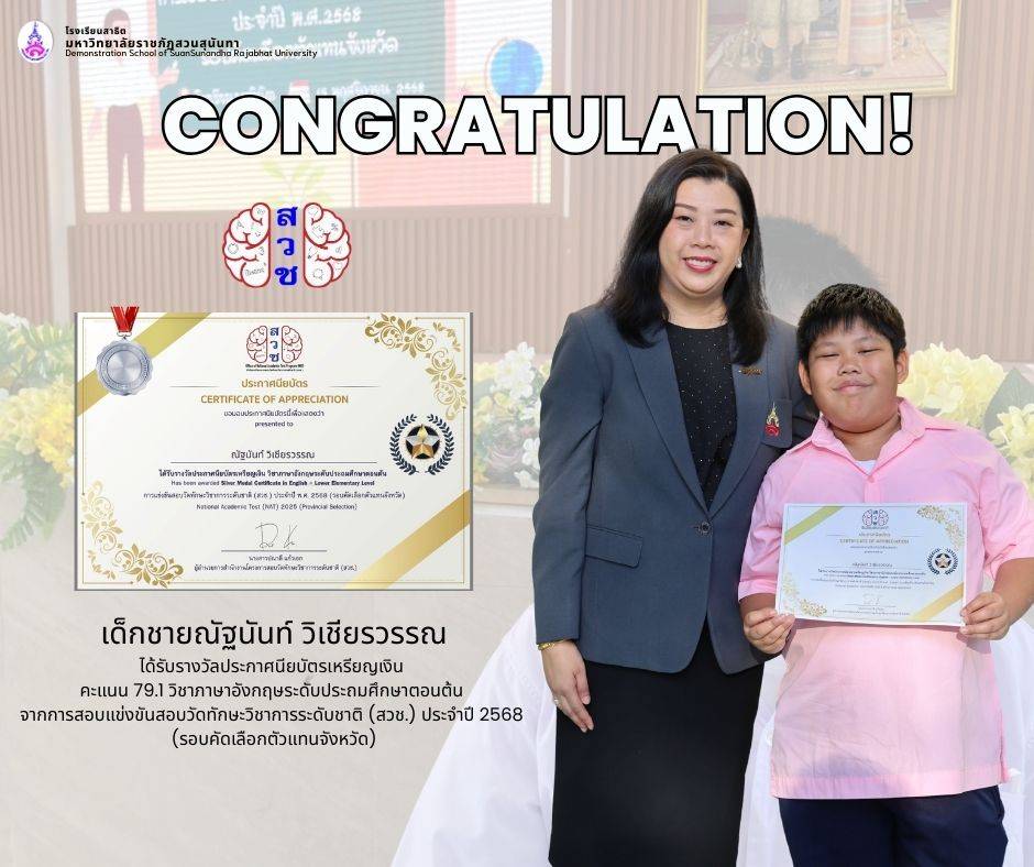 โรงเรียนสาธิตมหาวิทยาลัยราชภัฏสวนสุนันทา ขอแสดงความยินดีกับนักเรียนระดับประถมศึกษาที่ได้รับรางวัลจากการสอบแข่งขันวัดทักษะวิชาการระดับชาติ (สวช.) ประจำปี 2568 ซึ่งเป็นผลจากความตั้งใจ ความมุ่งมั่น และความสามารถทางวิชาการของนักเรียนทุกคน