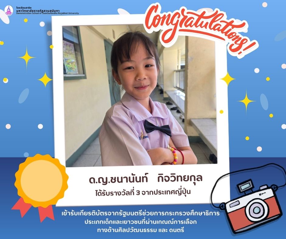 ขอแสดงความยินดีกับนักเรียนที่จะเข้ารับเกียรติบัตรจากรัฐมนตรีช่วยว่าการกระทรวงศึกษาธิการ ในวันที่ 8 มกราคม 2569 ณ หอประชุมคุรุสภา กระทรวงศึกษาธิการ ประเภทเด็กและเยาวชนที่ผ่านเกณณ์การเลือก ทางด้านศิลปวัฒนธรรม และ ดนตรี ประจำปี 2569 มีรายชื่อดังนี้