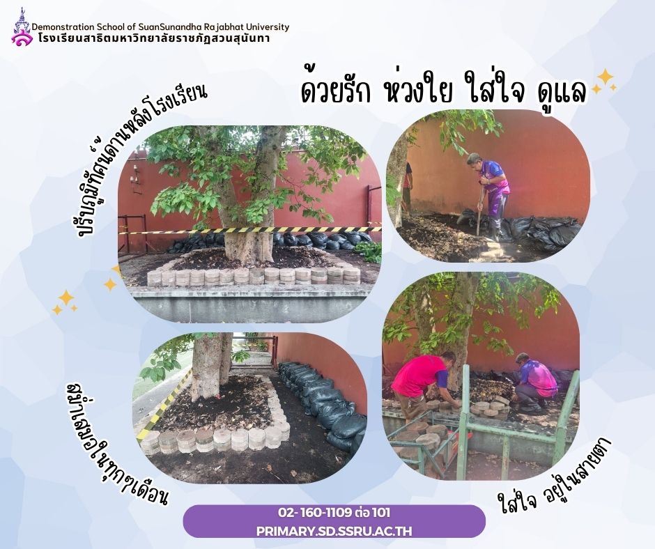 ปรับภูมิทัศน์และดูแลความสะอาดบริเวณข้างสนามหลังโรงเรียน