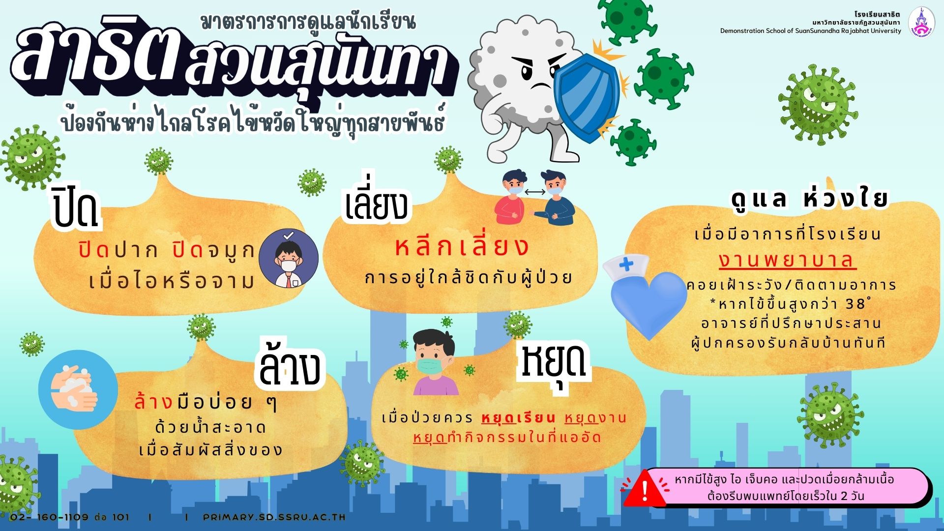 โรงเรียนสาธิตมหาวิทยาลัยราชภัฏสวนสุนันทา ให้ความสำคัญกับสุขภาพและความปลอดภัยของนักเรียน ครู และบุคลากรอย่างต่อเนื่อง โดยเฉพาะในช่วงที่ สถานการณ์ฝุ่นละอองเริ่มคลี่คลาย แต่การแพร่ระบาดของไข้หวัดใหญ่กลับมีแนวโน้มเพิ่มขึ้น ทางโรงเรียนจึงได้กำหนดมาตรการป้องกันและเฝ้าระวังอย่างเข้มงวด